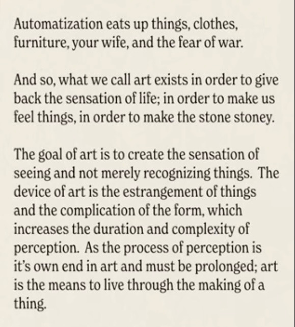 The Russian formalist critic and theorist Viktor Shklovsky wrote in his 1917 essay, ‘Art as Device (also translated as ‘Art as Technique’):